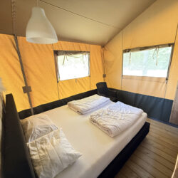 Elke safaritent staat op een houten vlonder van 45 m² en beschikt over een sfeervolle leefruimte met een zithoek en eettafel. Je hebt de beschikking over een eigen keuken en een privébadkamer met douche, toilet en wastafel. De tent heeft twee slaapkamers: één met een comfortabele tweepersoons boxspring en één met twee stapelbedden, ideaal voor gezinnen of kleine groepen. Buiten wacht een ruim terras met een picknicktafel, waar je tot in de late uurtjes kunt genieten van de omgeving.