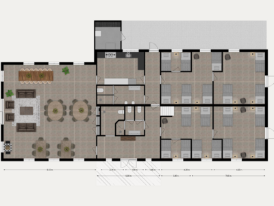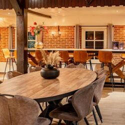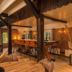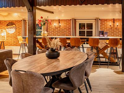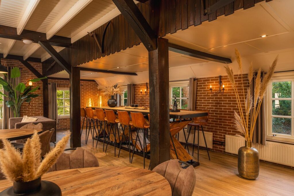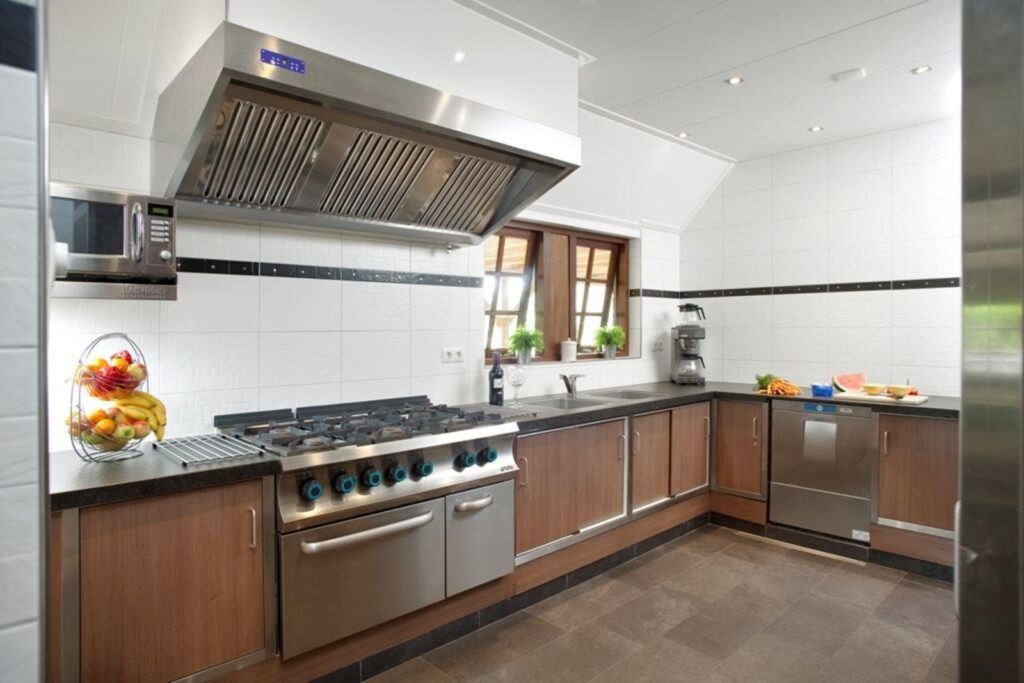 De woonkamer is het gezellige middelpunt van het huis. Hier vindt u een ruime zithoek, een grote bartafel en een flatscreen tv. Er is volop plek om samen te eten, te borrelen of een spel te spelen. De aangrenzende horecakeuken is compleet uitgerust met professionele apparatuur, waaronder een groot gasfornuis met oven, horecavaatwasser, koelkast, vriezer en twee filterkoffiezetapparaten.