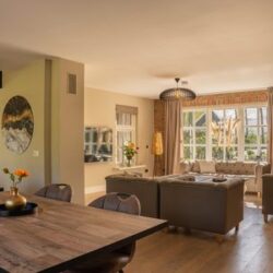 De villa beschikt over een sfeervolle woonkamer met haard en flatscreen-tv, een volledig uitgeruste keuken met inductiekookplaat, oven, magnetron en twee vaatwassers, en openslaande deuren naar het terras en de grote tuin. Zo loopt het binnenleven naadloos over in buitenplezier.