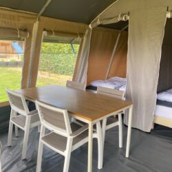 Binnen vind je een sfeervol leefgedeelte met een compleet keukenblok, voorzien van servies, keukengerei, een inductiekookplaat en een waterkoker. Alles wat je nodig hebt om eenvoudig te koken is aanwezig. De lodge tent beschikt over drie aparte slaapcabines: twee cabines met elk twee eenpersoonsbedden en één cabine met een eenpersoonsbed. Zo heeft iedereen zijn eigen plekje en blijft de tent overzichtelijk en comfortabel.