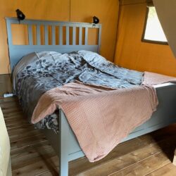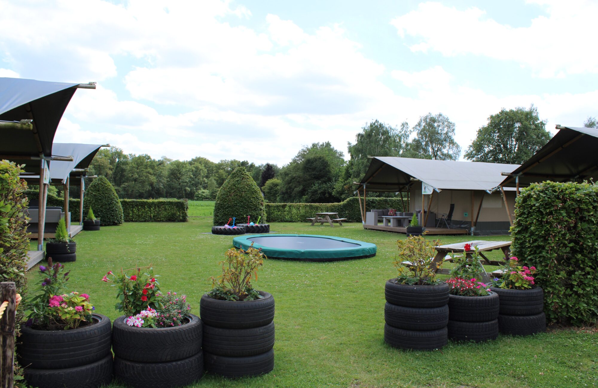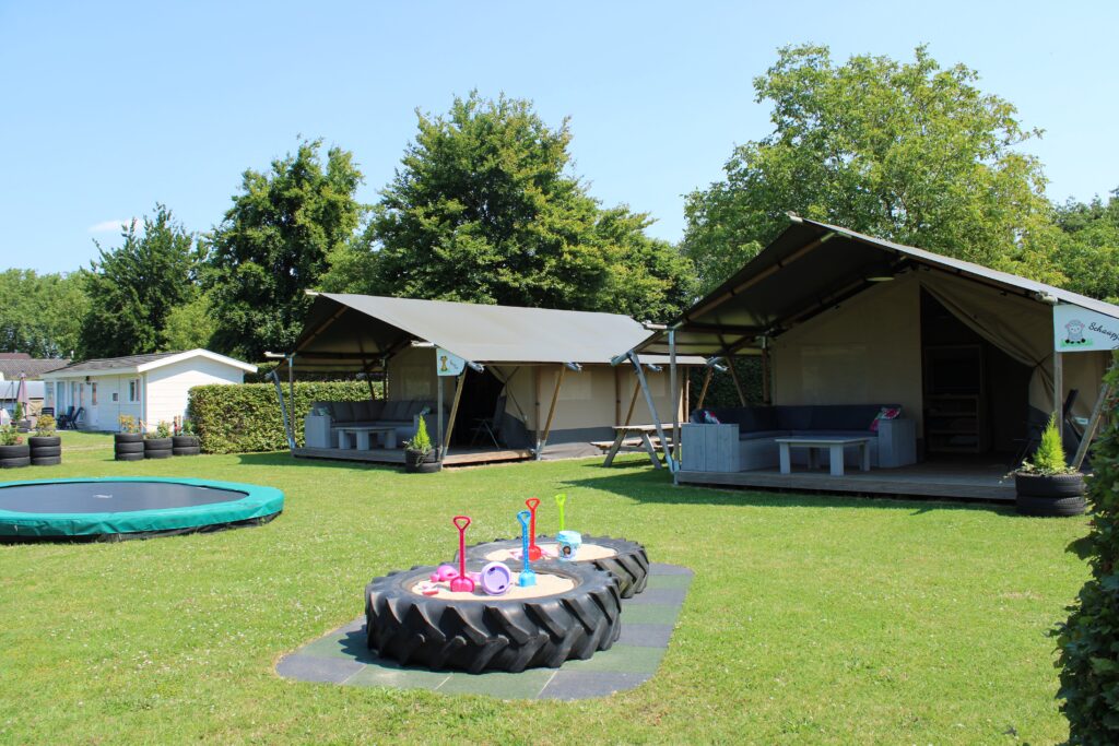Buiten wacht een ruime veranda met een comfortabele loungebank, perfect voor lange zomeravonden, een kop koffie in de ochtendzon of een goed boek terwijl de kinderen spelen. Want speciaal voor de safaritenten is er een trampoline en een zandbak aanwezig, een waar paradijs voor jonge gasten. Hierdoor zijn deze tenten bijzonder geschikt voor gezinnen.