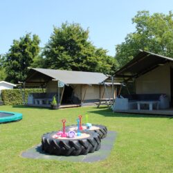 Buiten wacht een ruime veranda met een comfortabele loungebank, perfect voor lange zomeravonden, een kop koffie in de ochtendzon of een goed boek terwijl de kinderen spelen. Want speciaal voor de safaritenten is er een trampoline en een zandbak aanwezig, een waar paradijs voor jonge gasten. Hierdoor zijn deze tenten bijzonder geschikt voor gezinnen.