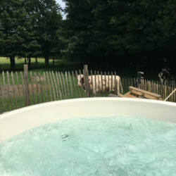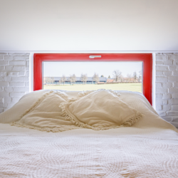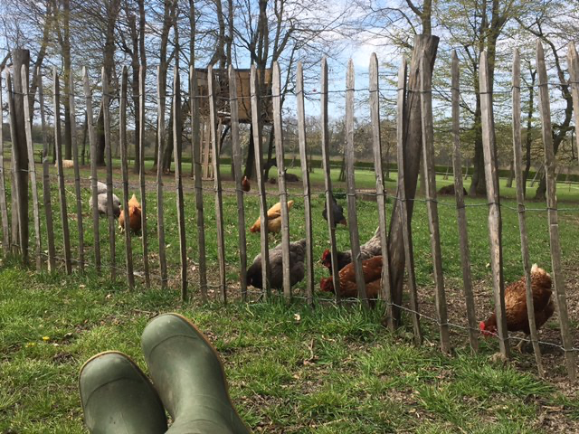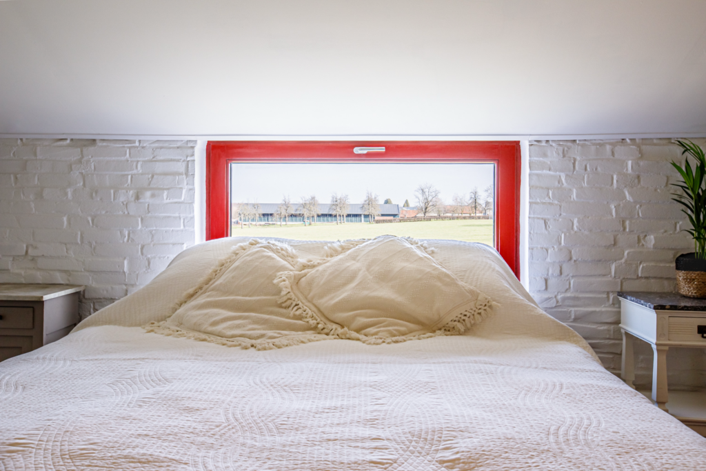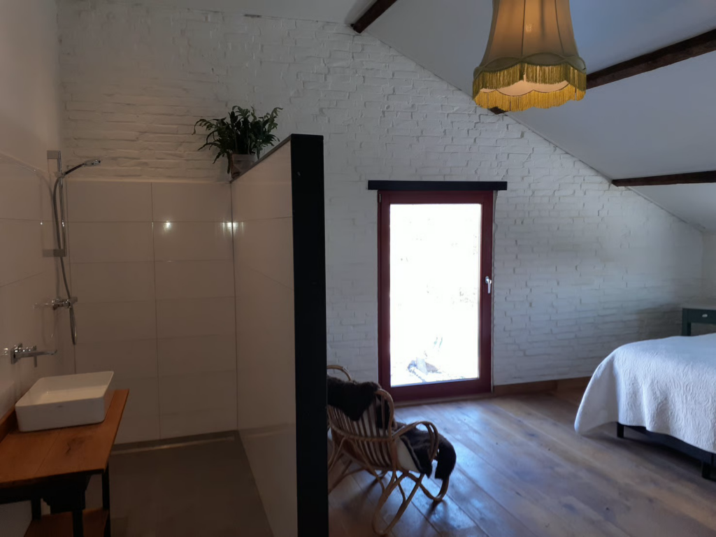 Rondom het huisje ligt het erf van de Bonte Haan, waar kippen, konijnen, schapen en varkens vrij rondlopen. Dit geeft het verblijf een speelse, boerderijachtige sfeer die vooral kinderen geweldig vinden. Buiten vind je een terras met uitzicht op het groen, perfect voor een kop koffie in de ochtendzon of een glas wijn tijdens de lange Limburgse avonden.