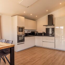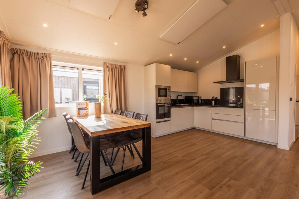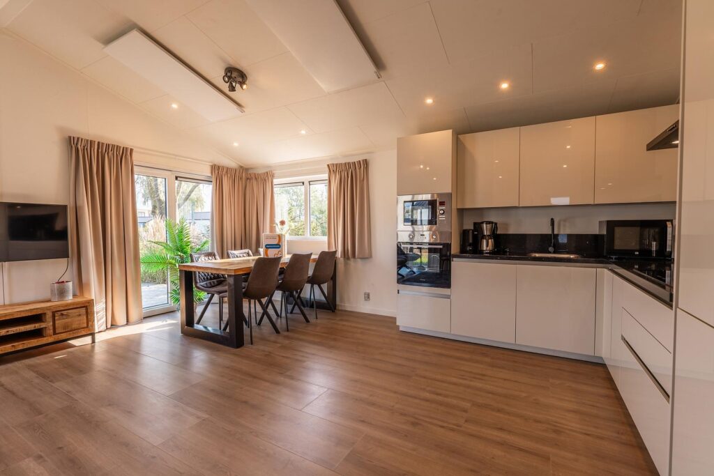De eigentijds ingerichte woonkamer beschikt over een gezellige zithoek met televisie, een eettafel voor lange diners en een open keuken met onder andere een vaatwasser, koffiezetapparaat en combimagnetron – ideaal voor wie graag zelf kookt.