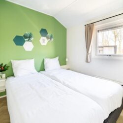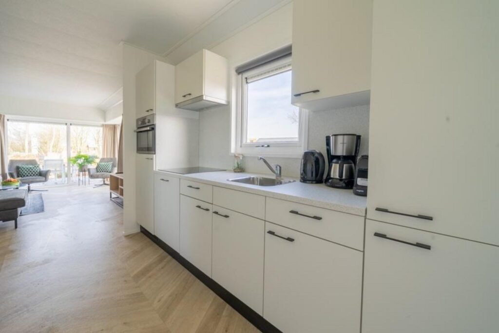 Velthorst 6 is een modern en comfortabel chalet, volledig gelijkvloers en ontworpen voor 6 personen. Dankzij de grote ramen is het binnen heerlijk licht en ruimtelijk. De woonkamer beschikt over een knusse zithoek met televisie, een eettafel en een complete keuken die is uitgerust met onder andere een vaatwasser, koffiezetapparaat en combimagnetron.