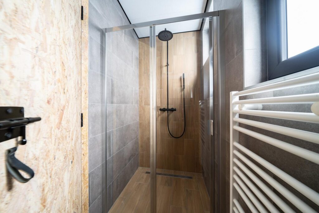 De lodge beschikt over 2 slaapkamers, elk met twee eenpersoonsbedden. De moderne badkamer is uitgerust met een douchecabine en een stijlvol badmeubel. Daarnaast is er een apart toilet aanwezig voor extra gemak.