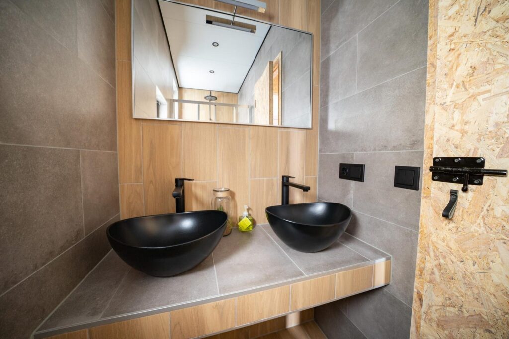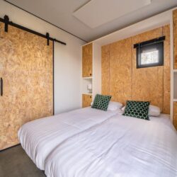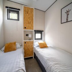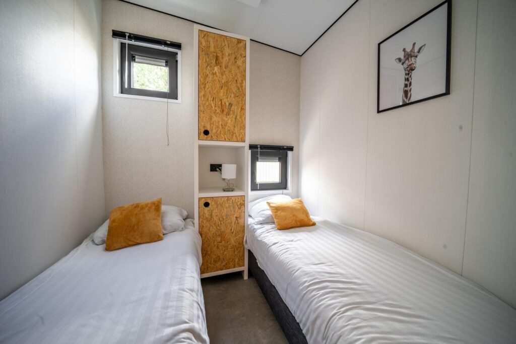 De lodge beschikt over 2 slaapkamers, elk met twee eenpersoonsbedden. De moderne badkamer is uitgerust met een douchecabine en een stijlvol badmeubel. Daarnaast is er een apart toilet aanwezig voor extra gemak.