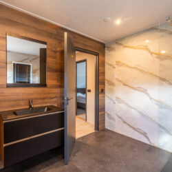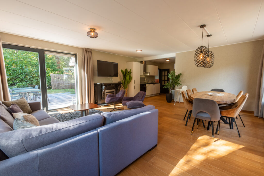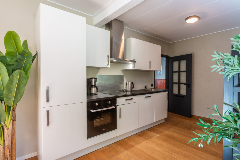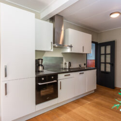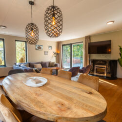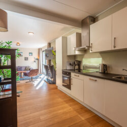 Op de begane grond vind je een royale zithoek met televisie en een sfeervolle haard, perfect om samen te relaxen. De gezellige eethoek nodigt uit tot lange diners, terwijl de volledig uitgeruste keuken – met onder andere een vaatwasser en koffiezetapparaat – het bereiden van maaltijden gemakkelijk maakt.