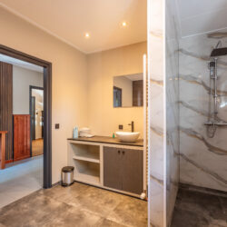 De villa heeft in totaal vier slaapkamers: twee beneden en twee boven, met samen 8 comfortabele eenpersoonsbedden. Er zijn ook twee badkamers met douche en toilet, plus een extra apart toilet voor extra gemak.