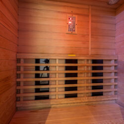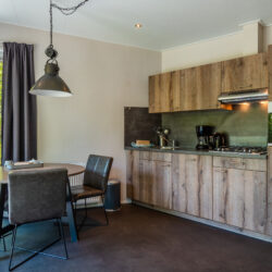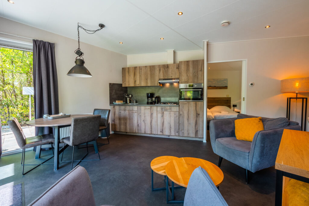De moderne woonruimte is sfeervol ingericht met een knusse zithoek en televisie, een eethoek en een compleet uitgeruste keuken met onder andere een vaatwasser, koffiezetapparaat en gasfornuis. In de slaapkamer staat een comfortabel tweepersoonsbed, en de luxe badkamer beschikt over een ligbad, toilet én een infraroodsauna – ideaal om helemaal tot rust te komen.