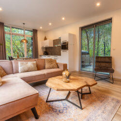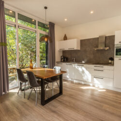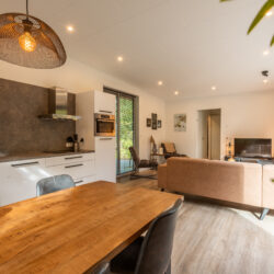 In de gezellige woonkamer vind je een comfortabele zithoek met televisie – perfect om na een actieve dag te ontspannen. De open keuken is van alle gemakken voorzien, met onder andere een inductiekookplaat, combimagnetron, vaatwasser, thermostaatkraan en een filter koffiezetapparaat.