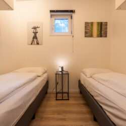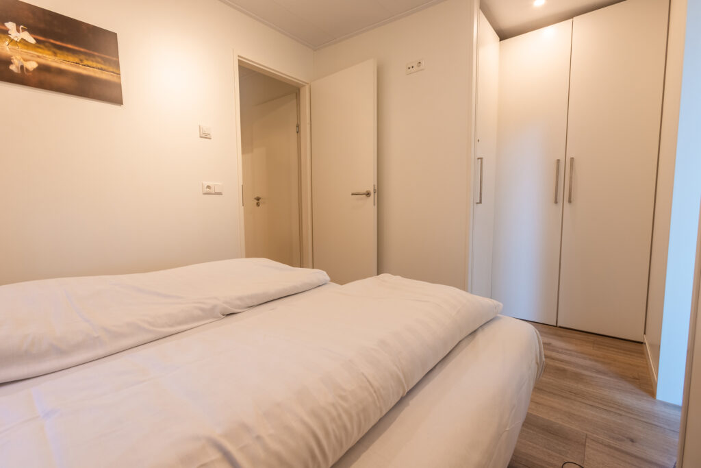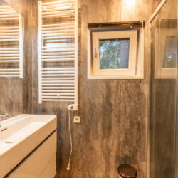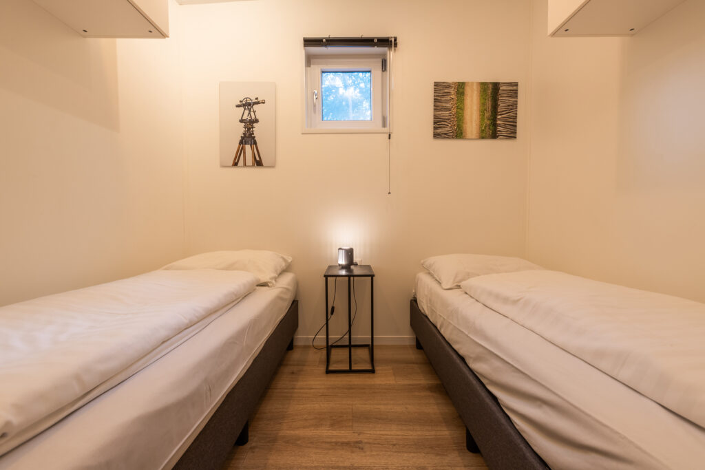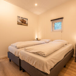 Het chalet beschikt over twee slaapkamers, elk met twee fijne eenpersoonsbedden. De moderne badkamer heeft een inloopdouche en een wastafel, en er is een apart toilet.
