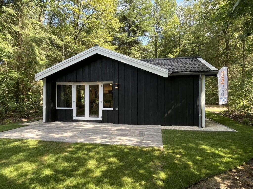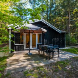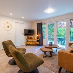 Via de openslaande deuren stap je direct je eigen tuin in, voorzien van comfortabel tuinmeubilair. Hier geniet je in alle rust van de bosrijke omgeving, met volop privacy en natuurgeluiden om je heen. Een perfecte plek om te ontspannen, te onthaasten en te genieten van het buitenleven.