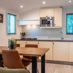 De Houtenborg Lodge is volledig gelijkvloers en biedt ruimte aan 4 personen. Door de sfeervolle afwerking en de ligging tussen de bomen ervaar je hier het ultieme buitengevoel. In de gezellige woonkamer geniet je van een comfortabele zithoek met televisie, een eethoek en een open keuken die van alle gemakken is voorzien, zoals een gasfornuis, vaatwasser, koelkast en koffiezetapparaat.