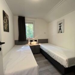 Er zijn twee slaapkamers, beide ingericht met twee losse eenpersoonsbedden. De moderne badkamer beschikt over een douche, wastafel en toilet.