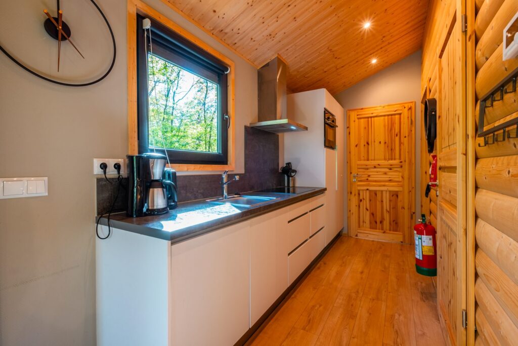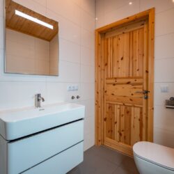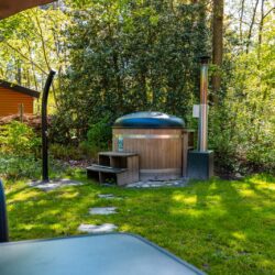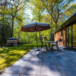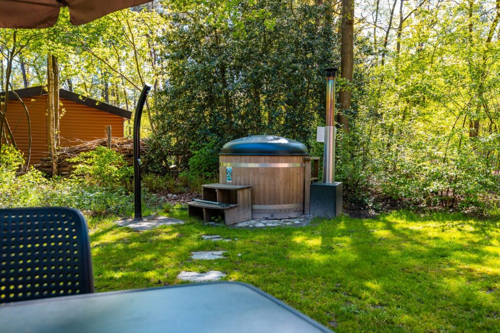 De badkamer is voorzien van een regendouche, wastafel en toilet. Buiten wacht een ruime tuin met terras, omringd door groen. Hier geniet je in alle privacy van je eigen hottub – een perfecte plek om te ontspannen na een dag in de natuur.