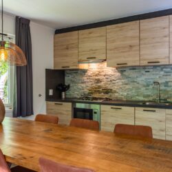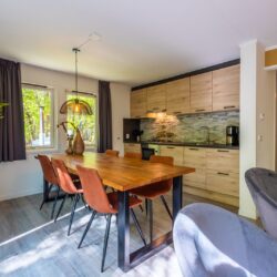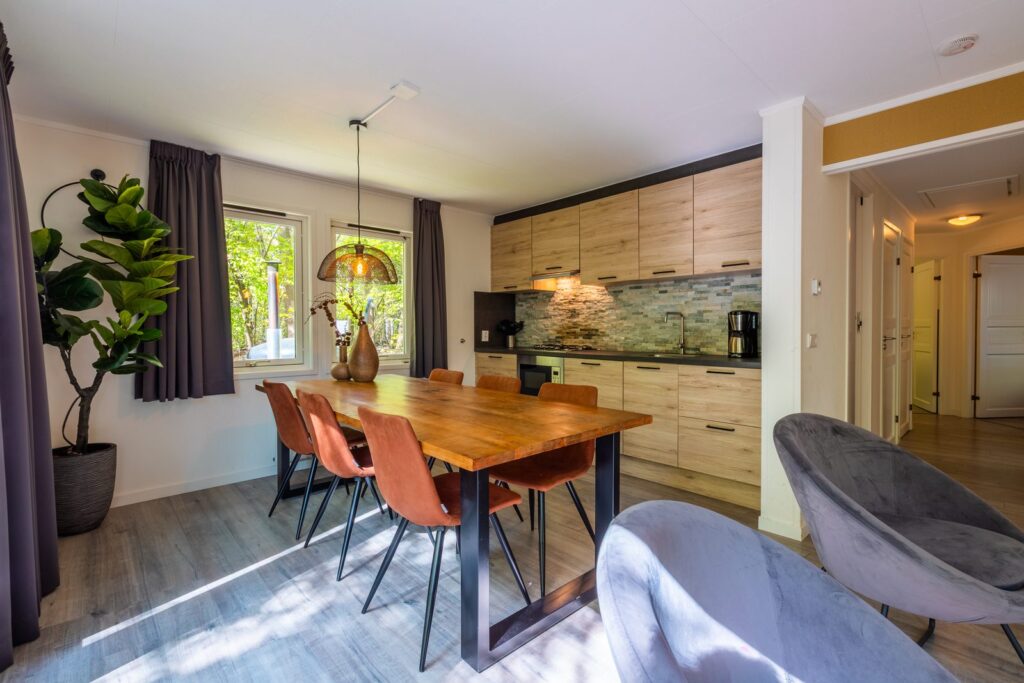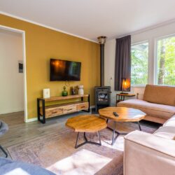 De sfeervolle woonkamer is ingericht met een gezellige zithoek, televisie en een warme sfeerhaard. Aansluitend vind je een knusse eethoek en een complete keuken met onder andere een gasstel, vaatwasser en koffiezetapparaat – ideaal voor een ontspannen avondje koken en tafelen.