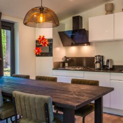 Binnen vind je een gezellige woonkamer met een comfortabele zithoek en televisie, plus een aparte eethoek voor lange, gezellige maaltijden. De open keuken is van alle gemakken voorzien, met onder andere een inductiekookplaat, combimagnetron, vaatwasser en een filter koffiezetapparaat – ideaal voor een ontspannen verblijf zonder gedoe.