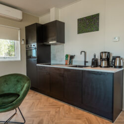 Binnen vind je een gezellige woonkamer met een fijne zithoek en televisie – perfect om even bij te komen na een actieve dag. De open keuken is praktisch én compleet ingericht, met onder andere een vaatwasser, combimagnetron en koffiezetapparaat.