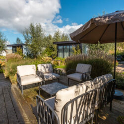 Het chalet beschikt over twee slaapkamers met drie en twee comfortabele eenpersoonsbedden. De badkamer is voorzien van een douche en toilet. Buiten kun je heerlijk genieten van je eigen terras met tuinmeubilair – een fijne plek voor een kop koffie in de ochtend of een goed boek in de namiddagzon.