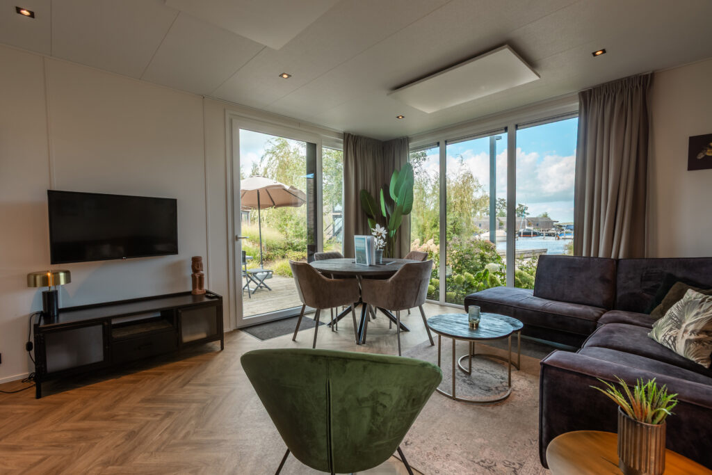 Binnen vind je een gezellige woonkamer met een fijne zithoek en televisie – perfect om even bij te komen na een actieve dag. De open keuken is praktisch én compleet ingericht, met onder andere een vaatwasser, combimagnetron en koffiezetapparaat.
