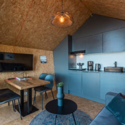 Tiny House Havenzicht is een gelijkvloers chalet van 30 m², slim ingericht en van alle gemakken voorzien. De lichte woonkamer is gezellig én praktisch, met een comfortabele zithoek, een eethoek en een smart-tv voor ontspannen avonden. In de moderne keuken vind je alles wat je nodig hebt, zoals een inductiekookplaat, waterkoker en een filter koffiezetapparaat – ideaal voor een rustig ontbijtje of een snelle lunch.