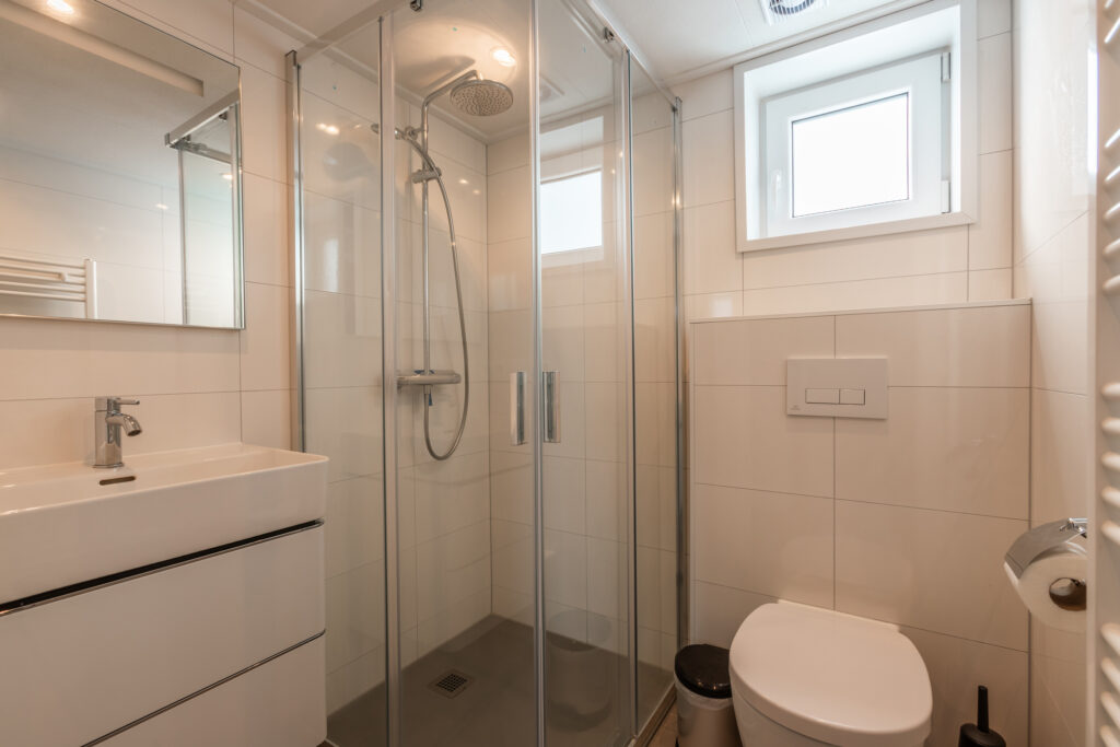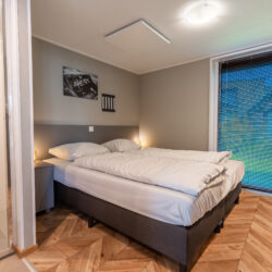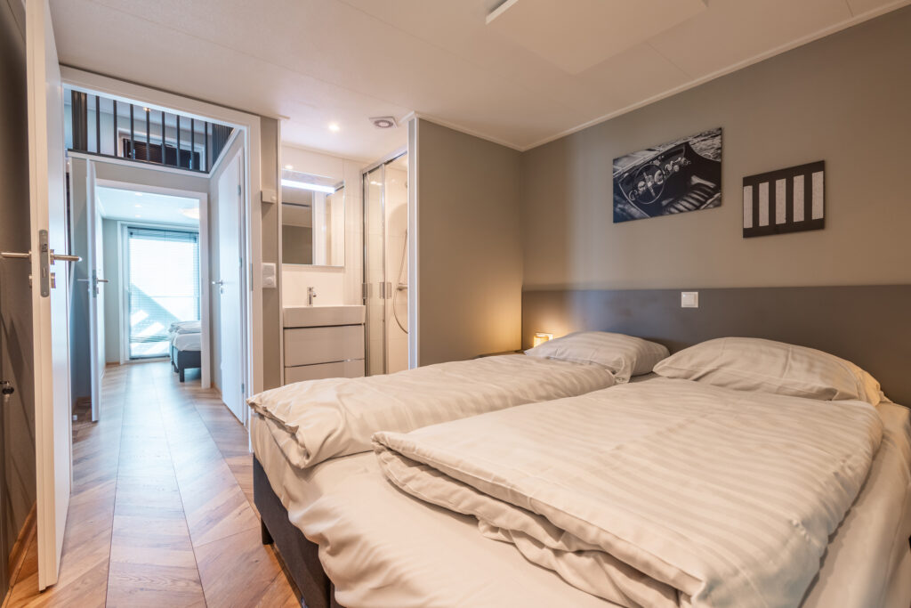 Er zijn twee slaapkamers, waarvan er één of beide zich op de begane grond kunnen bevinden. Beide kamers zijn ingericht met tweepersoonsbedden. Eén van de slaapkamers beschikt bovendien over een eigen douche en wastafel. De woning heeft daarnaast een luxe badkamer met douche en toilet.