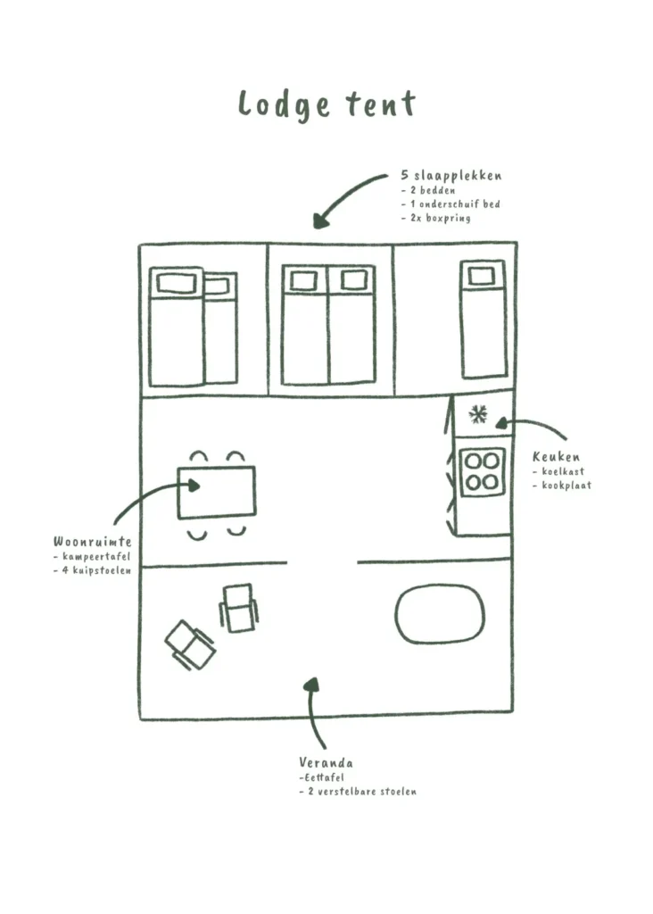 Dank der aufrollbaren Vorderwand verschmelzen Innen- und Außenbereich nahtlos miteinander. Das Zelt ist komplett ausgestattet mit festen Betten, einem Kühlschrank, einem Herd und praktischen Campingmöbeln. Mit fünf Betten, verteilt auf drei Schlafkabinen, brauchen Sie nur Ihr persönliches Gepäck und Ihre Bett- und Küchenwäsche mitzubringen. Einige Lodges stehen auf einem Holzpodest, andere direkt auf dem Boden.