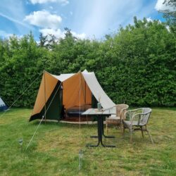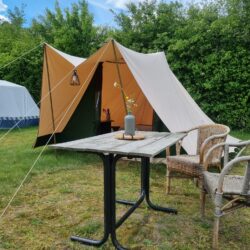 Das Zelt ist ausgestattet mit einem komfortablen Doppelbett inklusive Bettwäsche und Handtüchern, einem Schränkchen mit Kochutensilien und einem Gaskocher zum Kochen im Freien. Mit zwei Stühlen und einem Tisch kannst du die grüne Umgebung des Campingplatzes Ont-Moeten in vollen Zügen genießen.