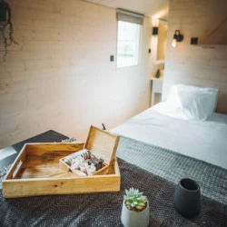 Der Wagen bietet Platz für vier Personen und verfügt über einen gemütlichen Schlafbereich, eine kompakte Sitzecke und eine eigene Terrasse mit Blick ins Grüne. Hier können Sie Ihr Frühstück in der Morgensonne genießen, am Nachmittag in einem guten Buch schmökern oder einen entspannten Abend unter den Sternen verbringen.