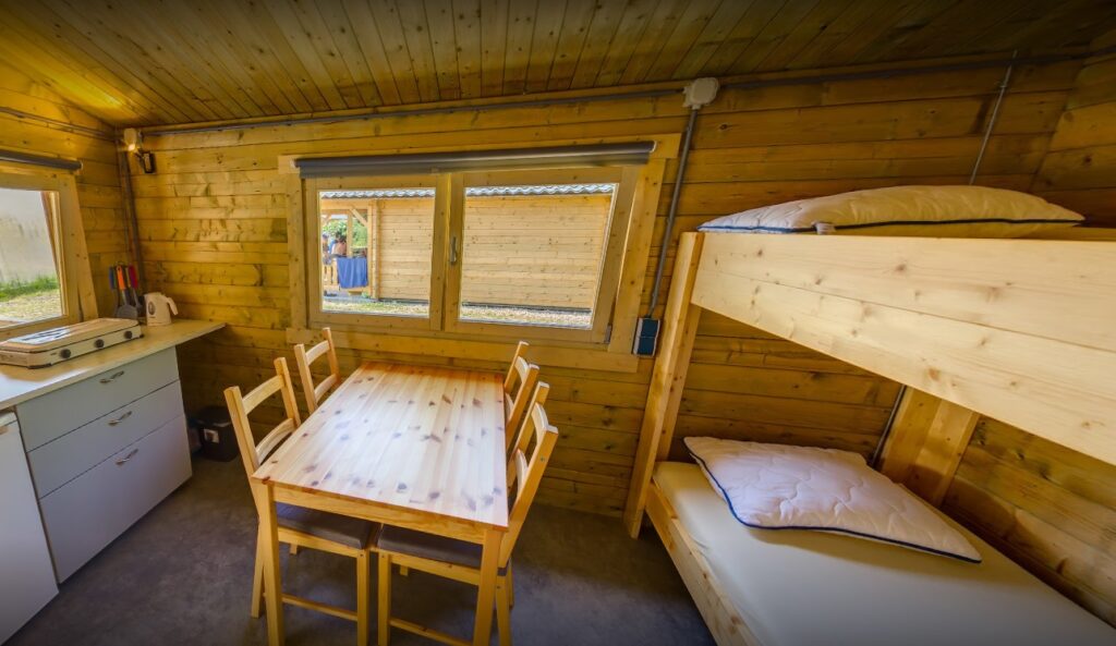 Der Campingplatz Sudersé in Workum bietet eine charmante Hütte für alle, die Ruhe, Natur und eine praktische Basis zur Erkundung Frieslands schätzen. Die Hütte ist für bis zu vier Personen geeignet und verfügt über zwei Etagenbetten, einen gemütlichen Sitzbereich, eine kleine Küchenzeile mit Kühlschrank und Kochplatte sowie eine Terrasse mit Sitzgelegenheit. Die Einrichtung ist schlicht, aber funktional und bietet alles, was man für einen kurzen Aufenthalt im Freien braucht.