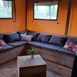 Die Safarizelte im Parc Sonnleiten verbinden Komfort mit einem echten Outdoor-Erlebnis. Mit einer Wohnfläche von 45 m² und großzügigen Stellplätzen von mindestens 100 m² genießen Sie viel Freiheit und Bequemlichkeit. Die Lodges sind für sechs Personen eingerichtet und verfügen zudem über ein Kinderbett für die Kleinsten. Im Inneren finden Sie eine große Sitzecke und einen separaten Essbereich sowie eine komplett ausgestattete Küche mit Kühlschrank und Gefrierfach, Vierflammen-Gasherd und fließendem Warm- und Kaltwasser. Es gibt drei Schlafzimmer: ein Elternschlafzimmer mit Doppelbett, ein Zimmer mit Etagenbett und Einzelbett sowie ein Zimmer mit Hochbett und Kinderbett. Das Badezimmer ist mit Dusche, WC und Waschbecken ausgestattet. Für kühlere Nächte im Frühling und Herbst steht eine Elektroheizung zur Verfügung. Bettdecken und Kissen sind vorhanden; Bettwäsche können Sie selbst mitbringen oder mieten. Auf der überdachten Veranda stehen ein Esstisch mit Bänken, Loungesessel und Liegestühle – ideal, um gemeinsam zu essen oder in der frischen Bergluft zu entspannen.
