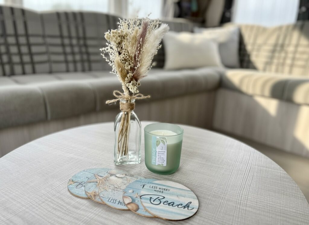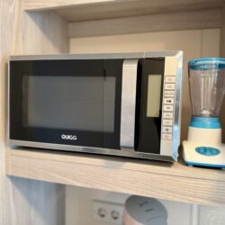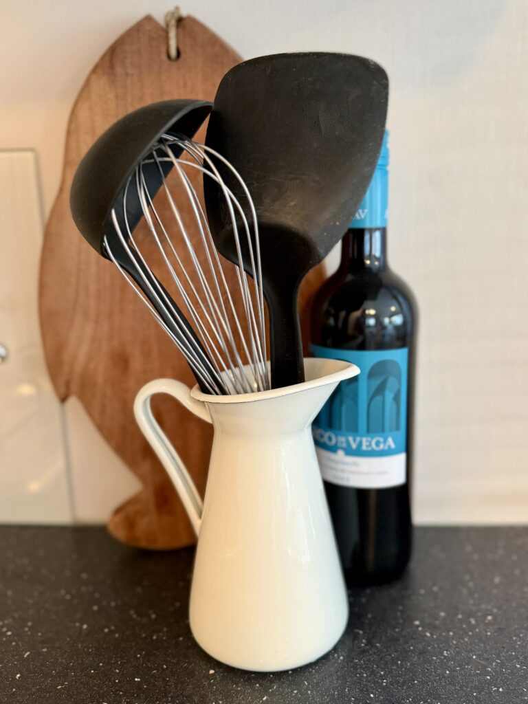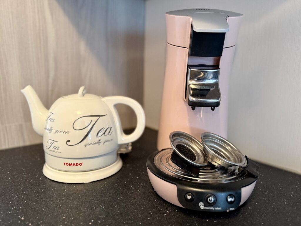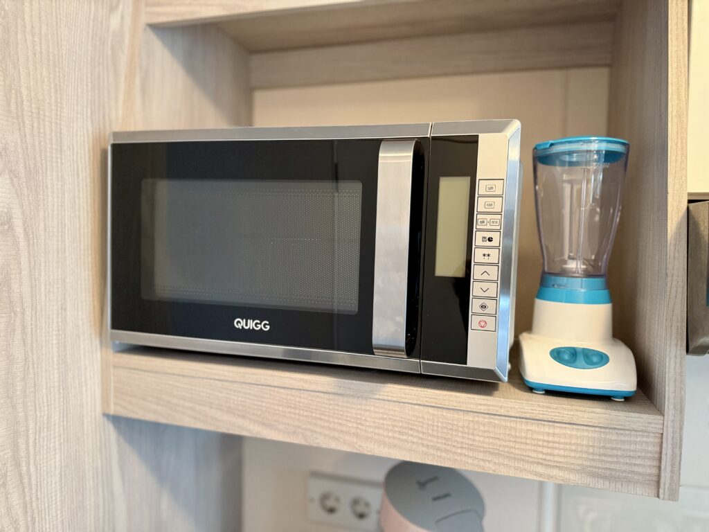 In the fully equipped kitchen, you can fry an egg in the morning or prepare a complete meal in the evening. You don’t have to eat with your plate on your lap — there’s enough space for everyone at the dining table.