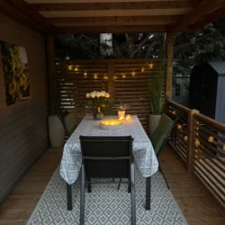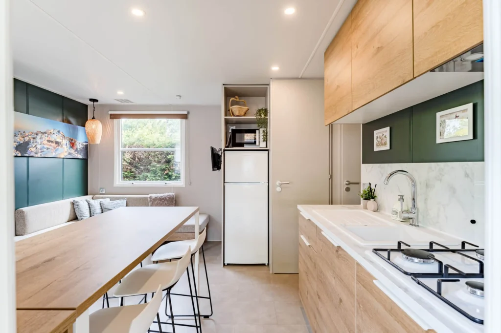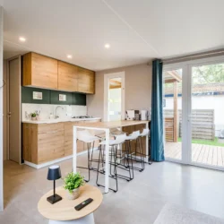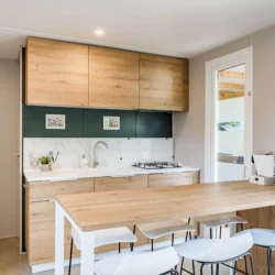 The house accommodates up to six people and features a modern interior, three bedrooms, a fully equipped kitchen, and a cozy living area. Thanks to the private terrace and peaceful location, it’s the perfect place to unwind — whether you enjoy breakfast in the morning sun or long summer evenings with views of the greenery.