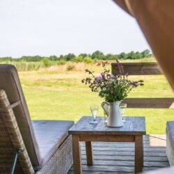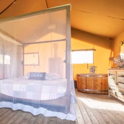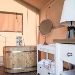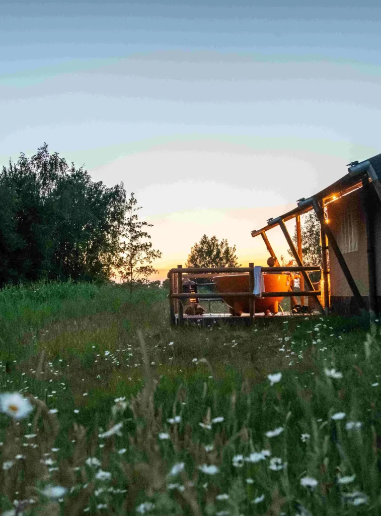 The Stoer Lodgetent Twin at Erfgoed Bossem is the perfect place for anyone who wants to experience the outdoors without sacrificing comfort. Tucked away among the greenery of Lattrop‑Breklenkamp, just a short distance from Ootmarsum and the Bergvennen nature reserve, you sleep here right in the heart of the Twente landscape. The tent is warmly furnished with a cosy canopy bed, a fully equipped kitchenette, a dining area and a private toilet. Outside, a wooden hot tub awaits for ultimate relaxation, along with a veranda featuring two sun loungers — the ideal spot to start your day with birdsong and end it with a glowing sunset.