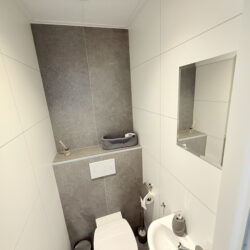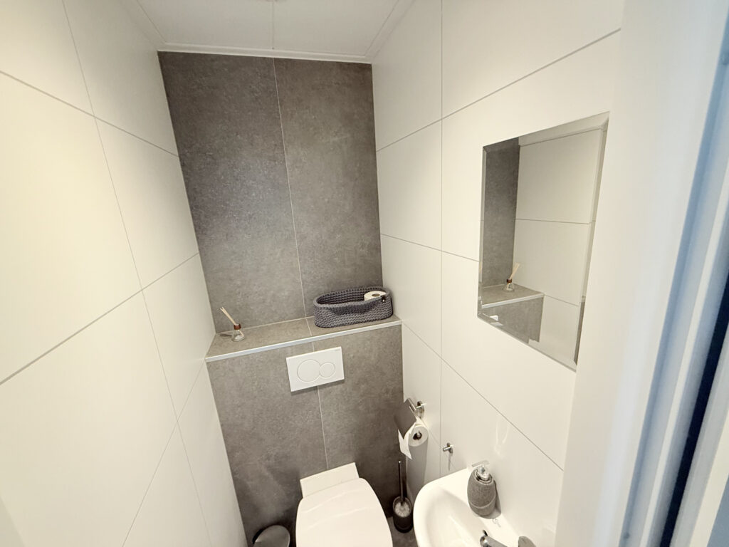 Inside, the villa is stylishly and comfortably furnished. Both bedrooms feature a double bed with high-quality mattresses – perfect for a good night’s sleep after a day outdoors. The bathroom is equipped with a modern shower, and there’s a separate toilet, providing extra privacy when staying with multiple guests.