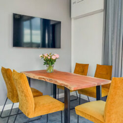 The kitchen is fully equipped, including a dishwasher and microwave, so whipping up a meal is quick and easy. Whether you opt for a full dinner or a simple breakfast at the table – everything is in place for a carefree stay. And thanks to the air conditioning, it remains pleasantly cool inside, even on the hottest summer days.