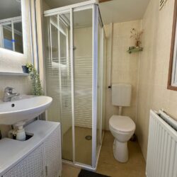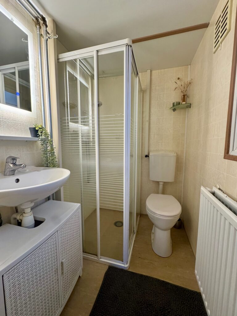 In the bathroom, you can relax after a long day outdoors under the lovely shower. The bathroom also includes a vanity unit with a sink and a toilet.
