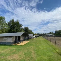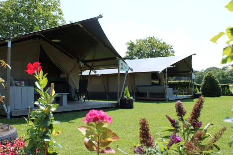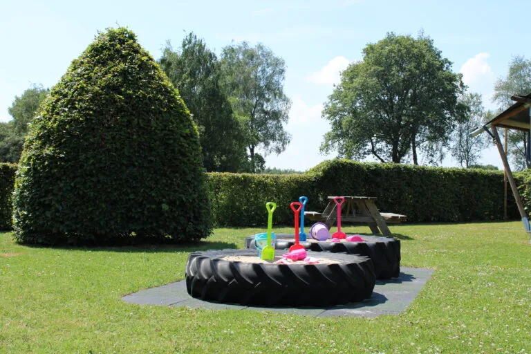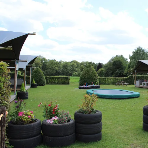 The mini campsite is tucked away among green fields, forests and walking trails, allowing you to step straight into nature from your accommodation. The site is well laid out and attractively decorated, with spacious camping pitches, a lovely chalet, comfortable safari tents and cosy lodge tents. Everything has been carefully arranged around the playground, so that families immediately feel at home and children can play freely.